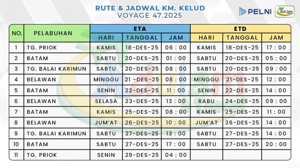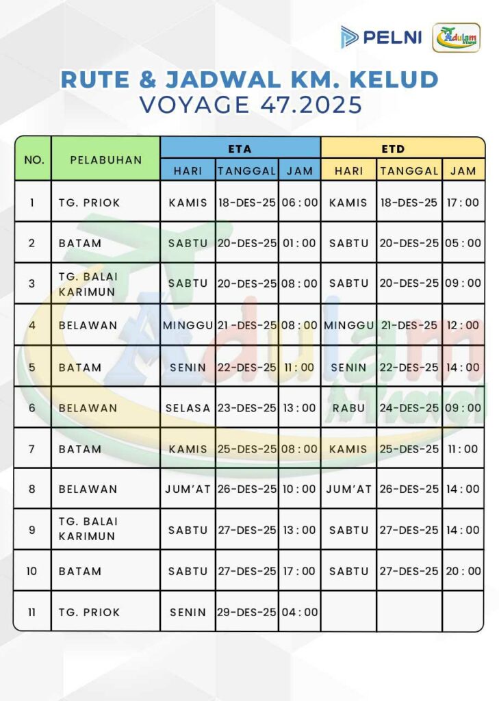 Tanjung Priok Jakarta – Tanjung Pandan – Pontianak – Semarang – Kumai – Karimun Jawa atau sebaliknya.
